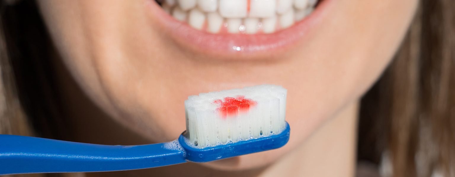 Close up of woman mouth with bleeding gums during teeth brushing. Periodontal disease, avitaminosis, gingivitis, scurvy