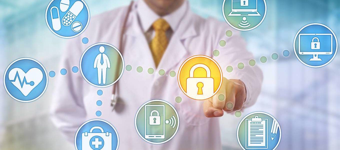 Unrecognizable doctor of medicine securing patient medical records across multiple devices via a computer network. Healthcare IT concept for security of health information exchange and data privacy.